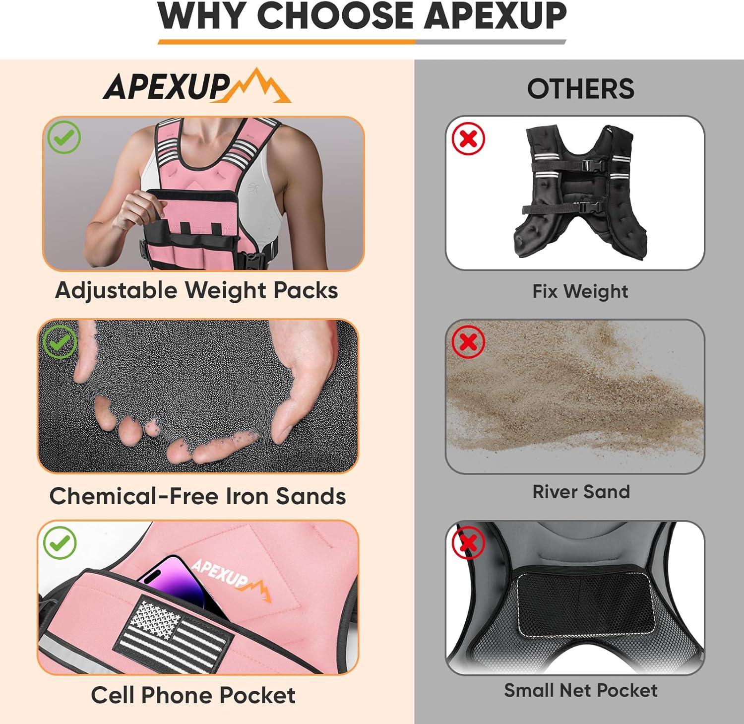 [ADJUSTABLE WEIGHTED VEST] APEXUP adjustable weighted vest has a base self-weight and comes with 6 sandbags, allowing you to adjust the weight according to your needs and saving you the trouble of buying multiple vests. Choose from 3 weight ranges based on your training stage, 4-10 pounds, 12-18 pounds, and 20-32 pounds